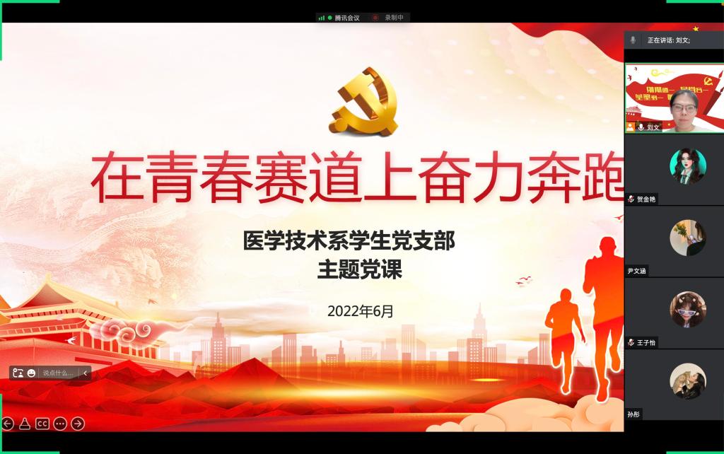 为庆祝中国共产党建党101周年,推进学生党支部党建工作深入开展,增强学生党员的党性修养,2022年6月25日晚8点,于腾讯会议平台,医学技术系学生党支部书记刘文以“在青春赛道上奋力奔跑”为题,为全体学生党员及入党积极分子上了一堂生动的党课。