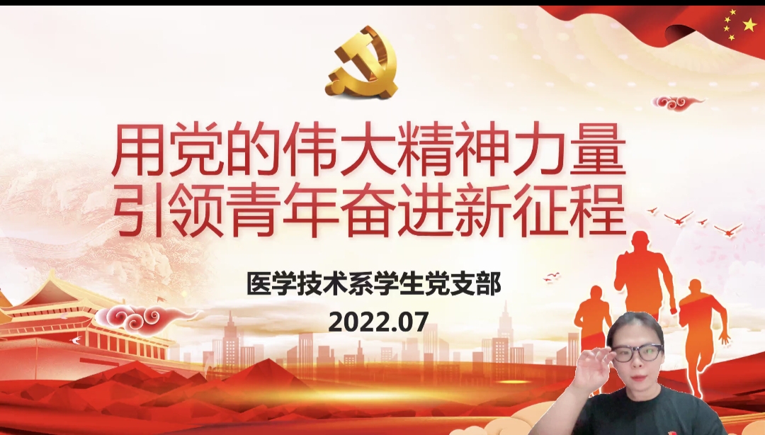 为贯彻落实《学院关于迎接党的二十大胜利召开组织开展“强国复兴有我”群众性主题宣传教育活动的方案》的要求,7月18日晚7点,在腾讯会议平台,医学技术系学生党支部书记刘文以“用党的伟大精神力量引领青年奋进新征程”为主题,为医学技术系入党积极分子及学生干部上了一堂生动的主题党课。医学技术系学工科科长王亚奇参加了此次活动。
