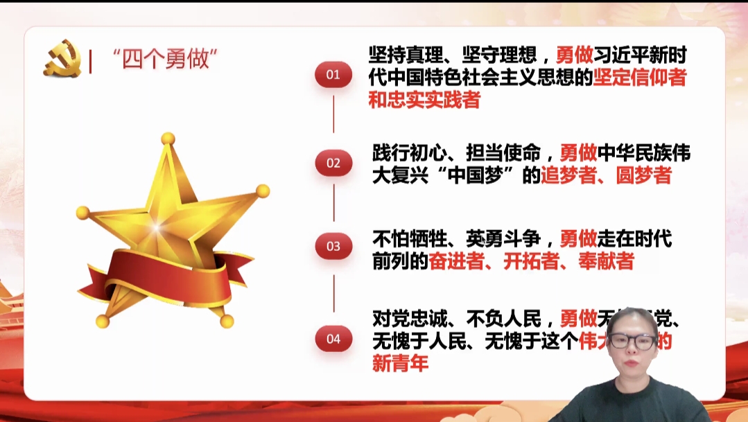 刘文同志要求入党积极分子和学生干部要发挥模范带头作用,以身作则,争做习近平新时代中国特色社会主义思想的坚定信仰者和忠实实践者;争做中华民族伟大复兴“中国梦”的追梦者、圆梦者;争做走在时代前列的奋进者、开拓者、奉献者;争做无愧于党、无愧于人民、无愧于这个伟大时代的新青年。让伟大建党精神深深融入到自身的血脉,提振自身的志气、骨气,在全面建设社会主义现代化国家新征程上勇毅前行,为实现中华民族伟大复兴的中国梦贡献出自己的力量。