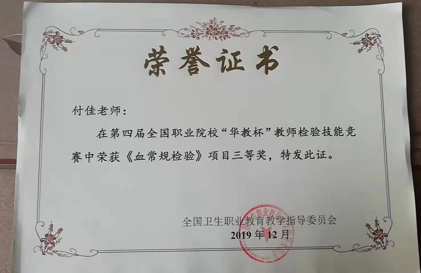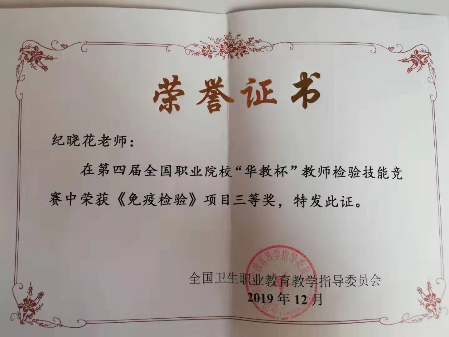 在院领导和各处室的大力支持下,2019年12月医学技术系纪晓花、付佳两λ老师参加了全国卫生职业教育教学指导委员会主办的第四节全国职业院校教师检验技能竞赛,经过激烈的角逐,纪晓花老师荣获《免疫检验》项目三等奖,付佳老师荣获《血常规检验》项目三等奖。