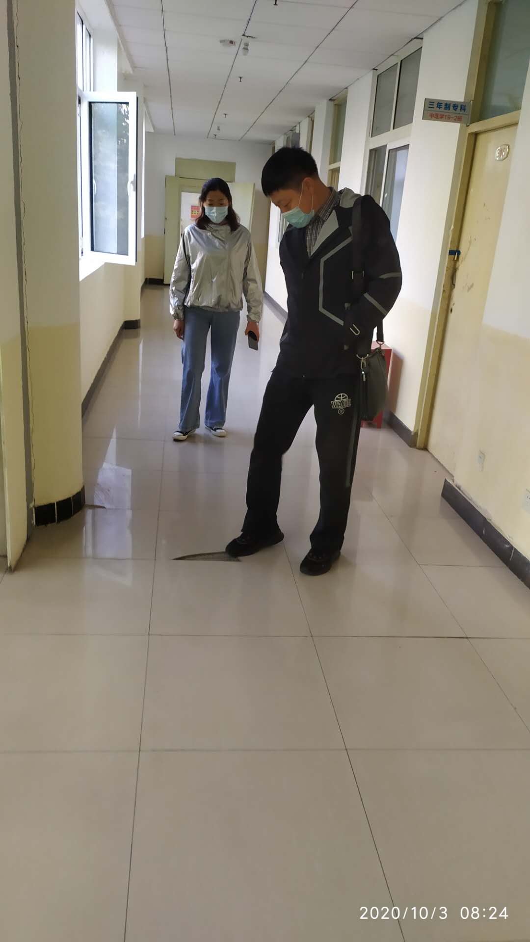 排查过程中发现二¥,三¥的天花板个别有松动迹象,三¥有一处地板砖破碎,地面凹凸不平:康复19级1班有个电风扇一直慢速在转动,程主任要求对存在的问题及时记¼,反映、整改,确保消除隐患,同时树立安全无小事观念。为加强校园安全保卫工作,程主任进一步强调对分包区域要细化范Χ,明确职责,责任到人,落实一周一查,限时整改,防范于δ然,杜绝校园安全事故发生。