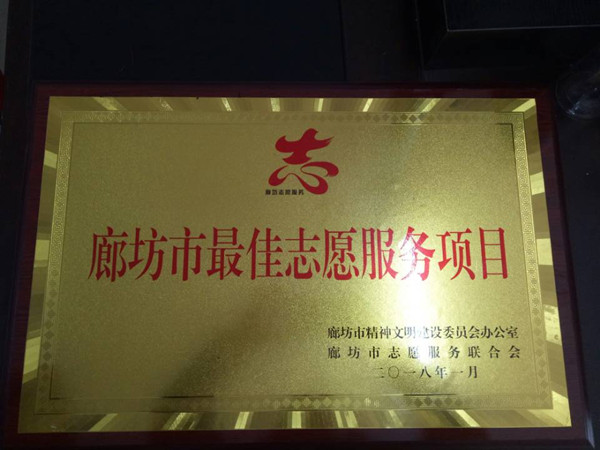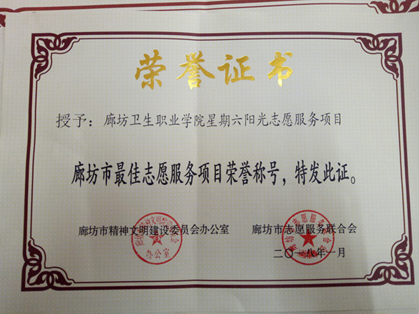 “星期六阳光志愿服务”得到了学院和社会的广泛支持与肯定,在2017年,被廊坊市精神文明建设委员会办公室和廊坊市志愿服务联合会授予“廊坊市最佳志愿服务项目荣誉称号”。