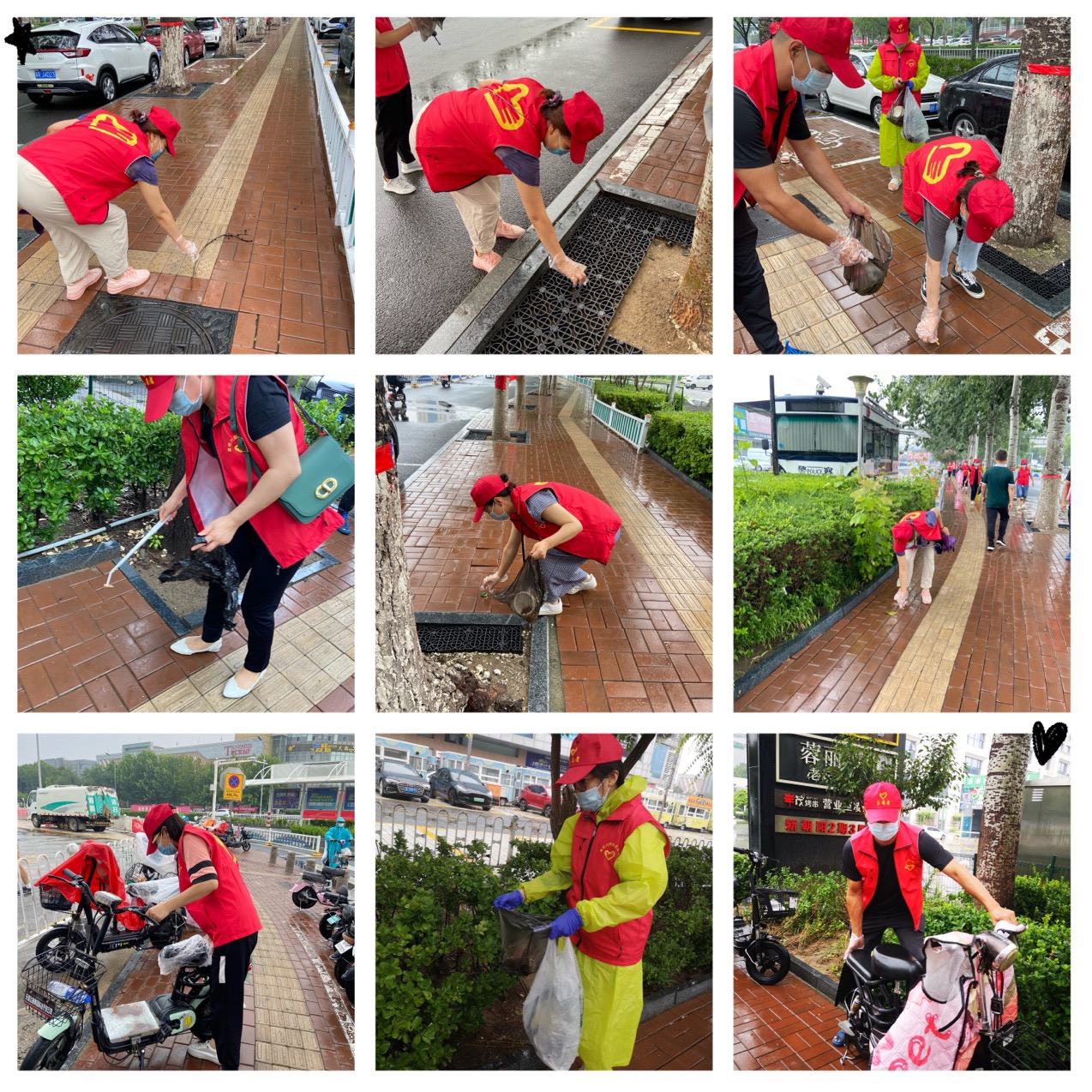 大家带着垃圾袋、垃圾夹、小铲子等工具,秉承着不怕雨淋、不怕脏、不怕累的精神,打着伞、穿着雨衣完成了一天的志愿服务活动。虽然天气恶劣,但是大家不抱怨,不推脱,十分认真细致的对和平路两侧人行道、绿化带内的烟头、纸屑、塑料袋等各类垃圾进行捡拾清理、对沿街的小广告进行及时清理。将乱放的自行车、电动车整齐摆放在停车位中。活动中,大家还呼吁周边的群众从自身做起,自觉爱护环境,用实际行动践行文明、弘扬文明。