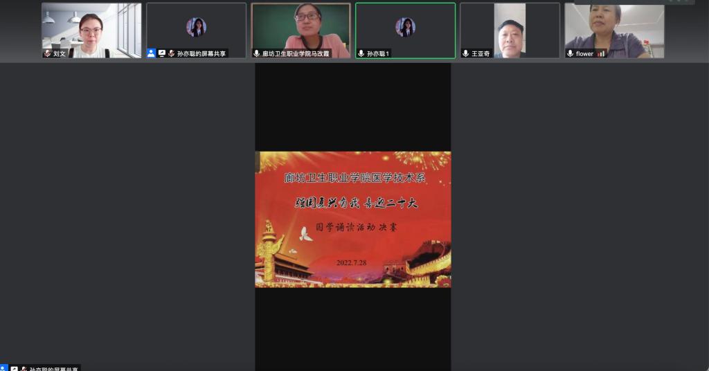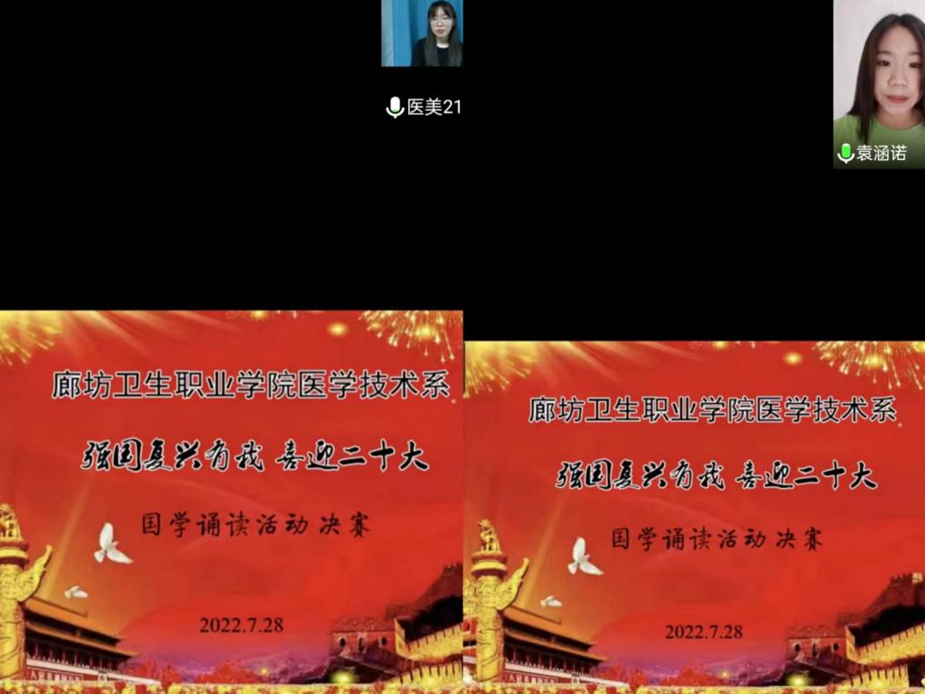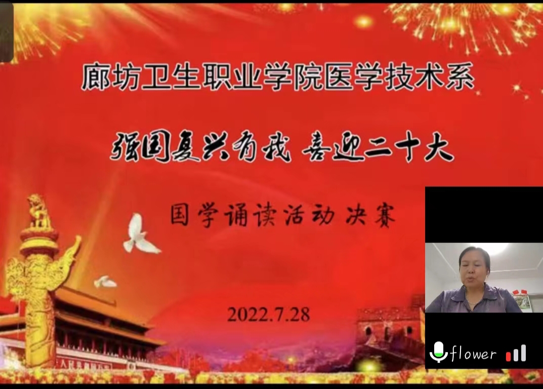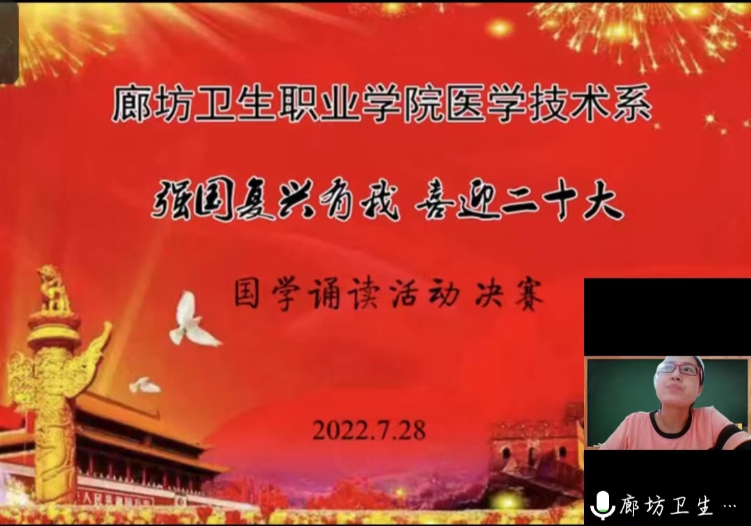 为弘扬中华优秀传统文化,落实立德树人根本任务,迎接党的二十大胜利召开,医学技术系组织开展了“强国复兴有我”国学诵读活动比赛。经过2周的紧张筹备、预赛和评比,最终6名同学进入决赛,决赛于7月28日晚7点在腾讯会议平台举行。党委委员、医技系党总支书记梁雍、医技系副主任马改霞、医技系学工科及全体辅导员参加了此次活动。其中王亚奇、宋淑艳、刘文、赵硕、蔡永攀老师担任此次决赛的评委。
