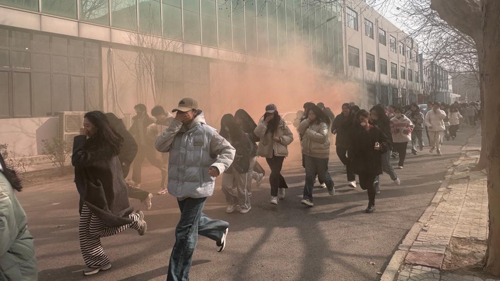 随着警报声响起,消防演习正式开始。模拟火场浓烟滚滚,各班级学生在辅导员和班干部的指挥下,用湿毛巾捂住口鼻,弯腰低姿,沿着预定疏散路线迅速撤离至安全区域。整个疏散过程紧张有序,师生们行动迅速,配合默契,达到了预期效果。
