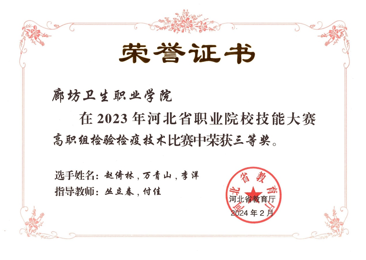2022年,教学质量考核优秀。2023年参加第二届全国职业院校检验科普作品大赛(教师组)荣获二等奖;2023年指导学生参与第二届全国职业院校检验科普作品大赛(学生组)荣获二等奖;2023年指导学生参与河北省职业院校技能大赛(高职)检验检疫技术比赛荣获三等奖;2024年指导学生参与第七届全国职业院校检验专业微课大赛(学生组)荣获三等奖;2024年指导学生参加河北省职业院校技能大赛(高职)检验检疫技术比赛荣获二等奖。2024年指导学生参加一带一路暨金砖国家技能发展与技术创新大赛医学实验诊断职业技能赛项荣获三等奖。