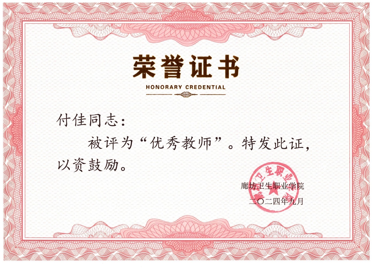 付佳老师被评为优秀教师
