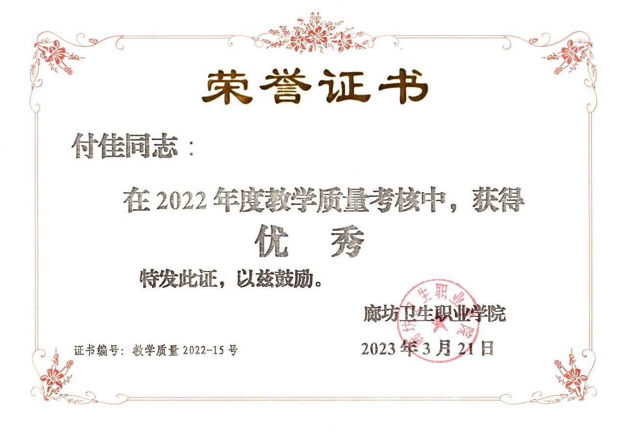 付佳老师年度教学质量考核优秀