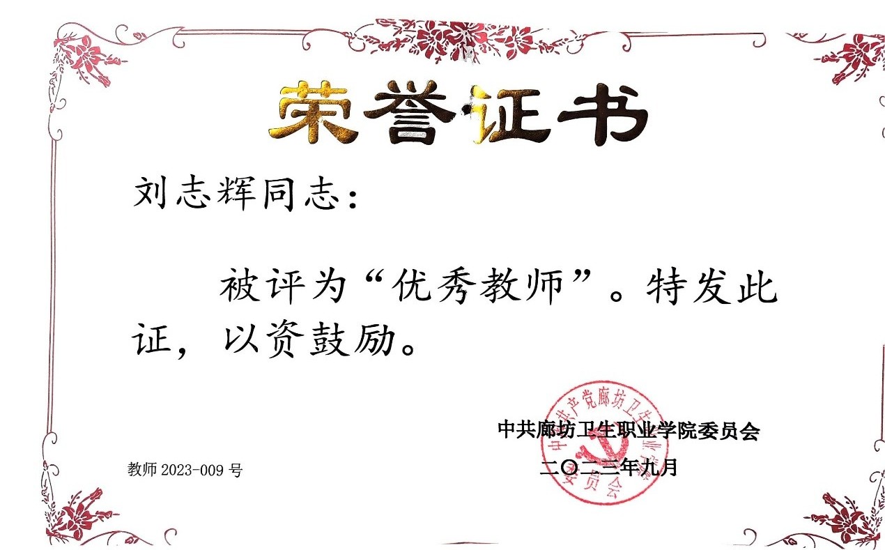 刘志辉老师获优秀教师称号