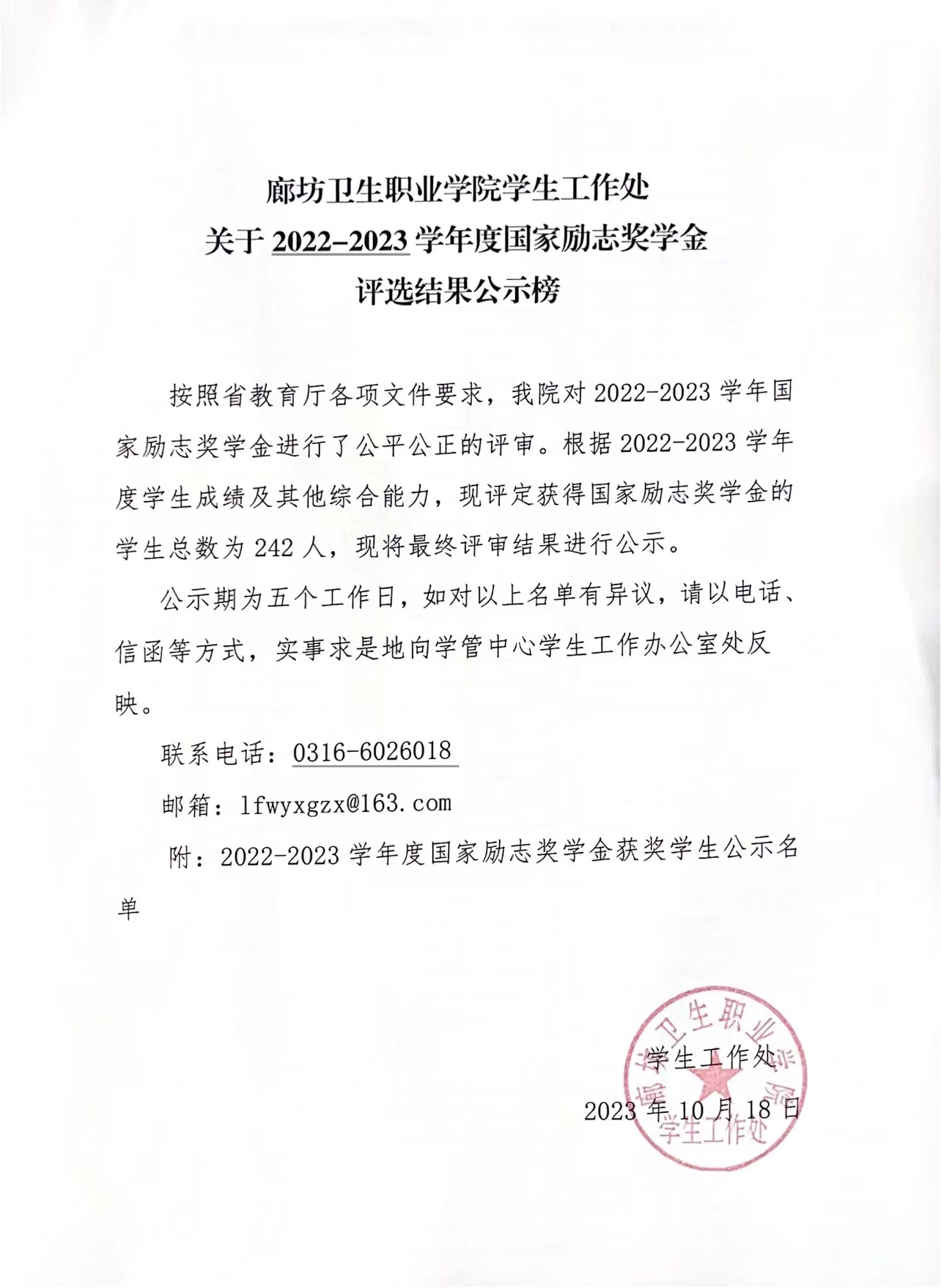 廊坊卫生职业学院学生工作处 2022-2023学年度国家励志奖学金评选结果公示