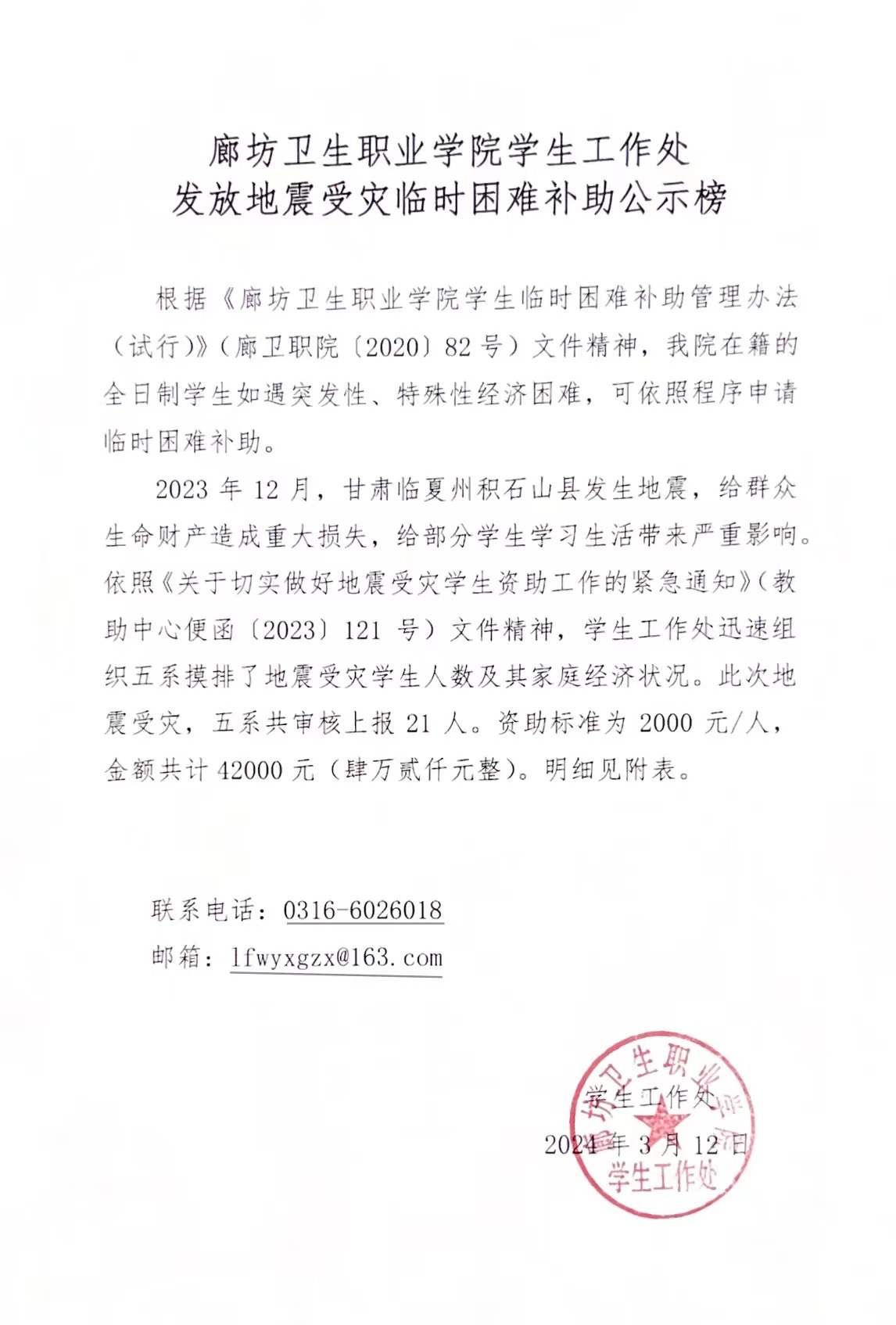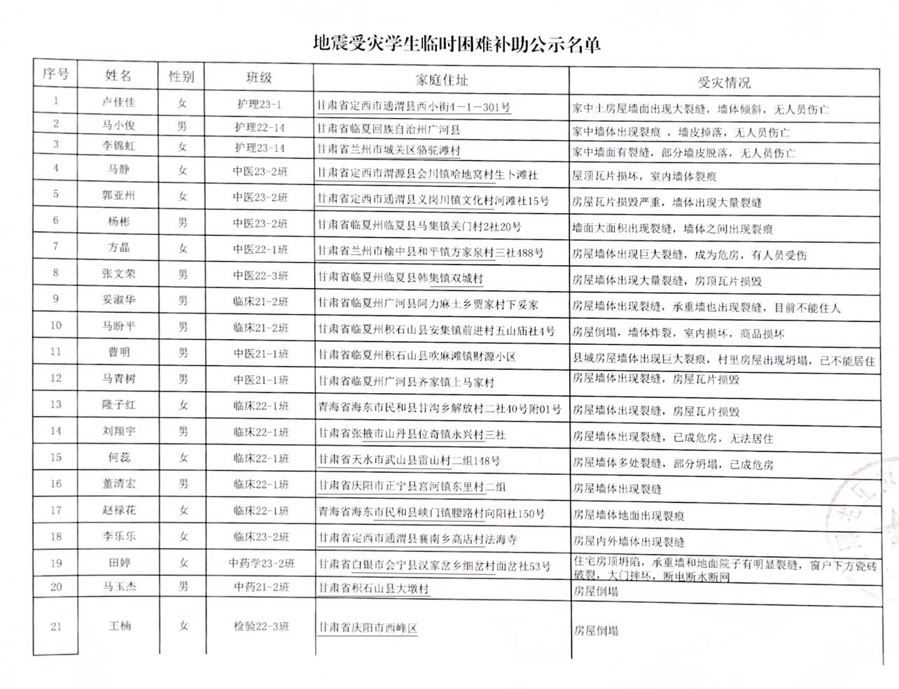廊坊卫生职业学院学生工作处 发放地震受灾临时困难补助公示榜