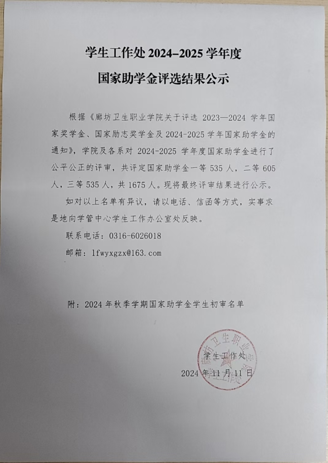 廊坊卫生职业学院学生工作处 2024-2025学年度国家助学金评选结果公示