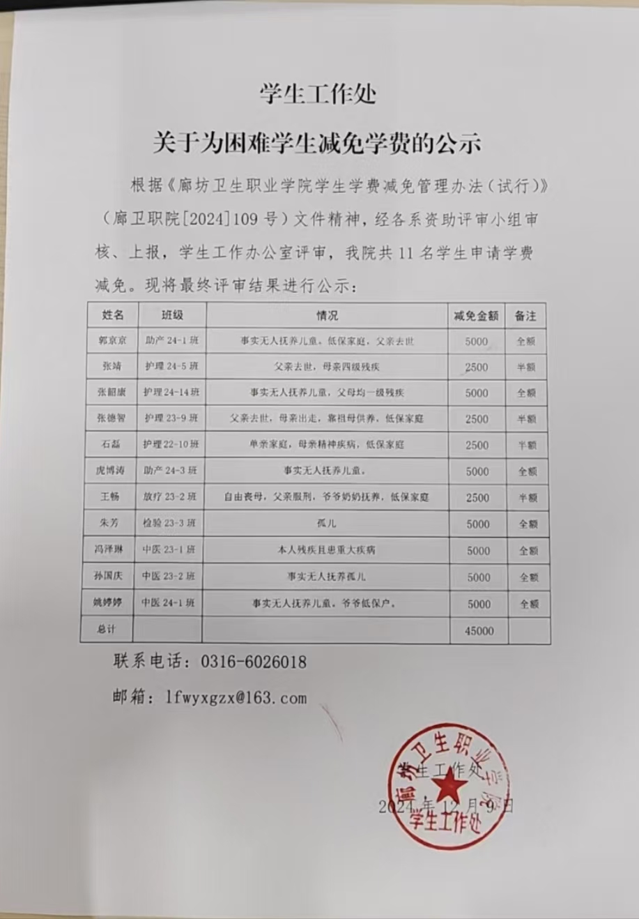 廊坊卫生职业学院 学生工作处关于为困难学生减免学费的公示
