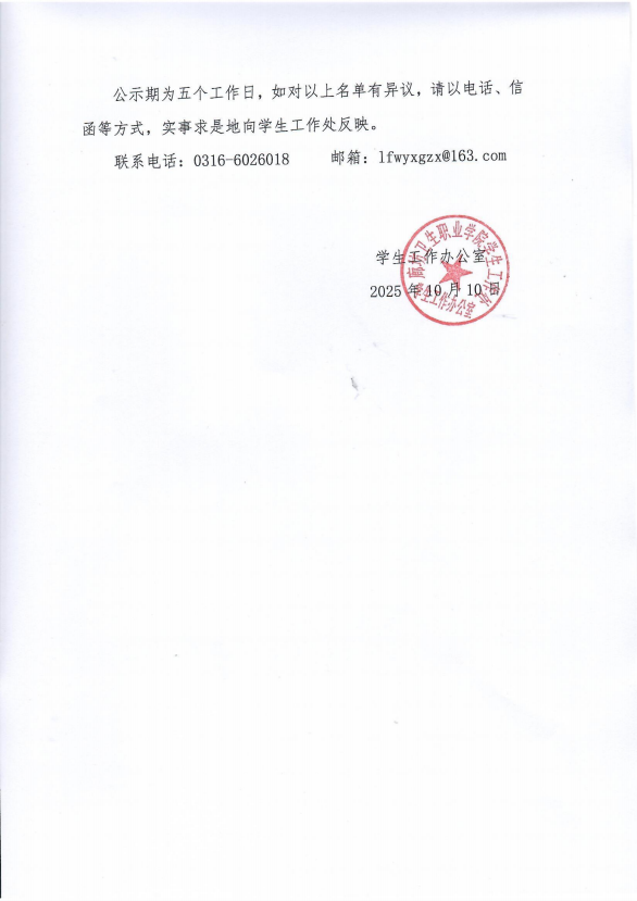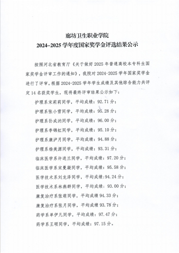 廊坊卫生职业学院 2024-2025学年度国家奖学金评选结果公示