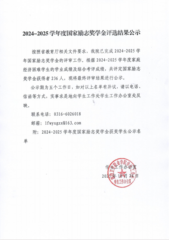 廊坊卫生职业学院 2024-2025学年度国家励志奖学金评选结果公示