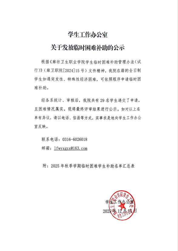 廊坊卫生职业学院学生工作办公室关于发放临时困难补助的公示