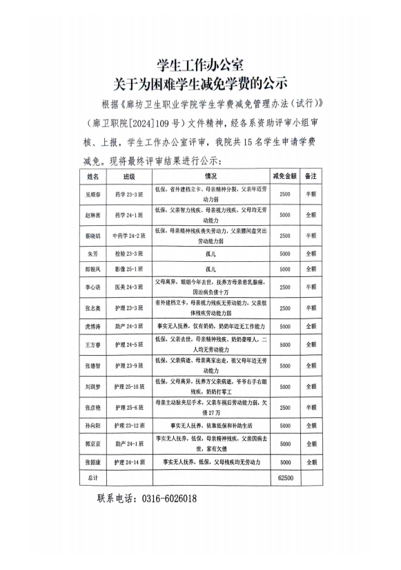 廊坊卫生职业学院学生工作办公室关于为困难学生减免学费的公示