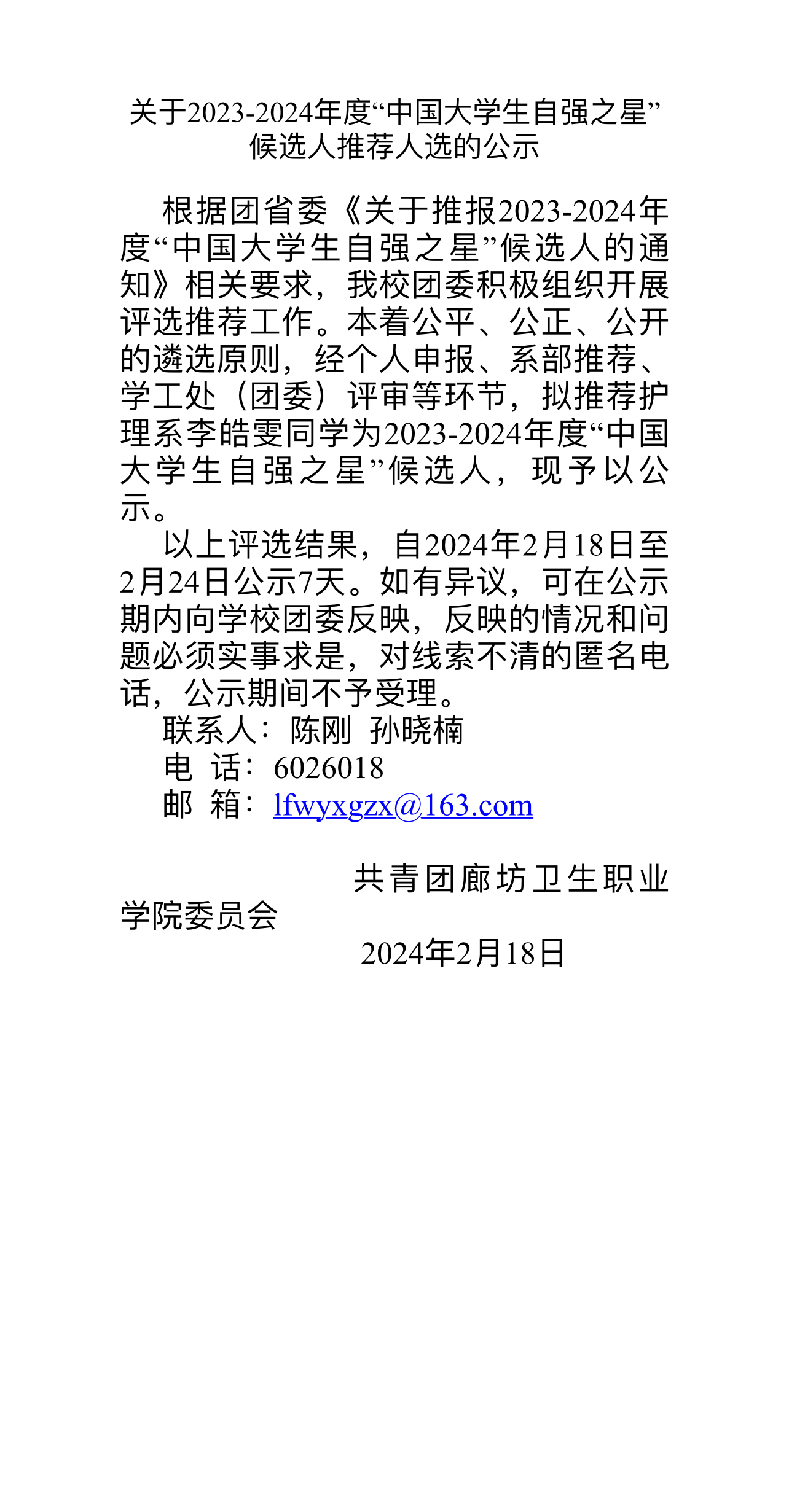 关于2023-2024年度“中国大学生自强之星”候选人推荐人选的公示