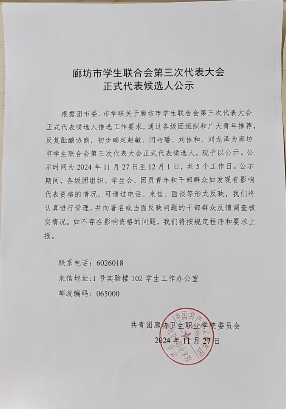 廊坊市学生联合会第三次代表大会 正式代表候选人公示