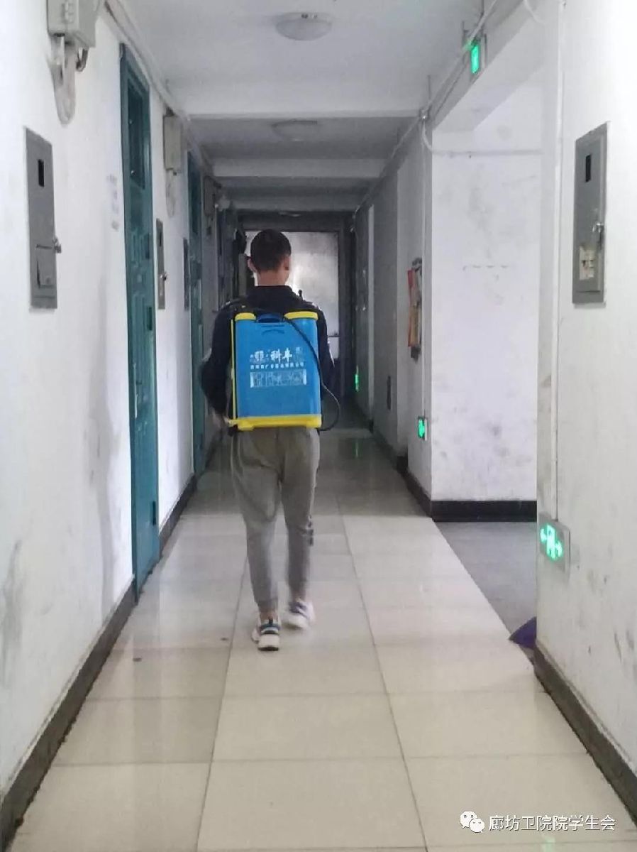军务部同学对宿舍楼公共走廊、楼梯进行喷洒消毒液方法进行消毒,针对窗缝、墙角等平时同学们很少会注意到的地方进行系统消毒清理以减少细菌与病毒的滋生,并把公共卫生间列为重点消毒范围,重点消杀。同学们也积极进行配合,认真负责地将每一个角落进行消毒。同时,干事们提醒同学们在季节交替的流感多发期注意个人卫生,保持宿舍内空气流通。