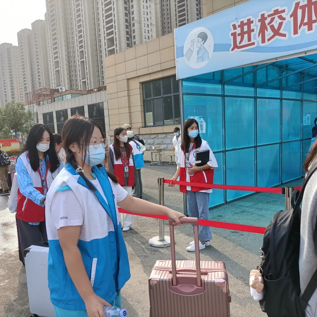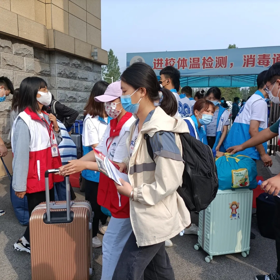 根据疫情防控要求老师们在校门口为每一位新生测量体温,检查按要求所带的七份文件。志愿者们在校外疏导新生有序进入校园,并帮助行李多的同学送回宿舍。不论是老师还是志愿者,他们都不辞辛苦,无私奉献,在自己的工作岗位上认真负责,核对好每位新生的入学资料。
