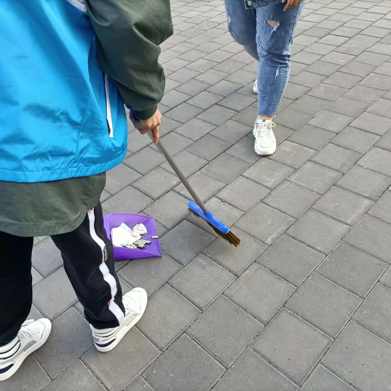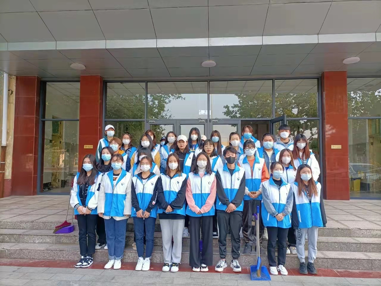 云挡住了太阳,却挡不住同学们工作的脚步。所有同学分成不同的小组,负责不同的工作。在这个清晨,随处可见同学们劳动的身影,街道上、宿舍前、教学楼旁、操场中,甚至是那时常无人问津的小树林内都能看到,这一位位身着白蓝志愿服,手拿清扫工具的“天使”们。