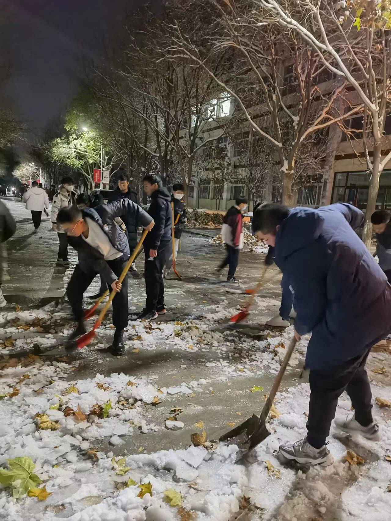 寒潮来袭,凛冬将至,校园里的雪景真是美不胜收,令人不禁感叹大自然的力量!大雪褪去,在我们留念雪花漫天飞舞时,它还留下了裹满银霜的地面。为广大师生出行安全着想,老师们及护理系学生会全体男生共同清扫校园道路上的积雪,为便利师生们在校园行走保驾护航。