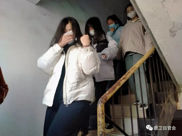 随着警报响起,同学们用湿毛巾捂住口鼻,弯腰小步快走,按照逃生演练方案设定的逃生路线,从最近的消防通道,快速有序地撤离到安全地带。到达安全地后,同学在现场指挥的安排下,迅速清点人数,并向现场指挥进行汇报。演练中,同学们无摔倒、碰撞等意外情况发生。演练结束后,主任对整个演练情况进行了总结,肯定了同学们在演练中能够做到快、静、齐,达到了预期的目的。