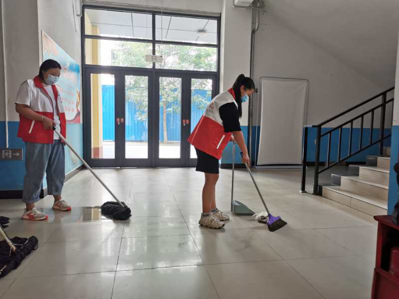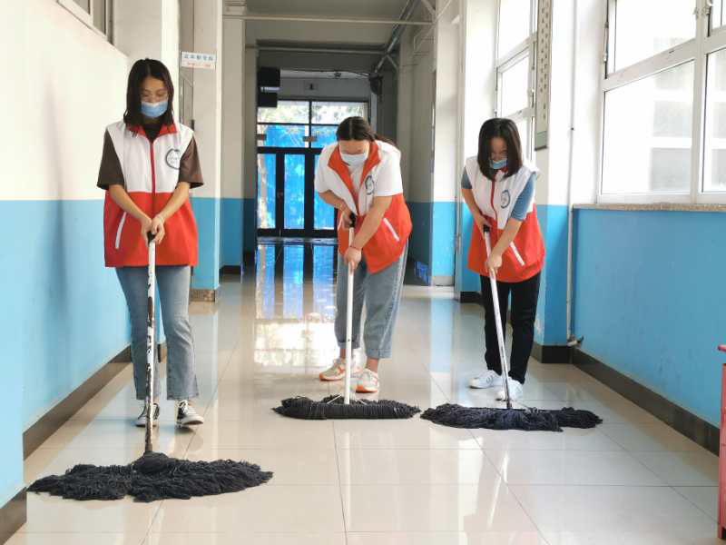 活动现场,返校学生志愿者们分工协作,有的捡拾草地垃圾,有的拿着扫帚、拖把清扫教学楼,有的擦拭扶手窗台等。顶着炎炎烈日、每一位志愿者都挥汗如雨,对学院花坛、道路、教学楼走廊等地方进行了拉网式清理。