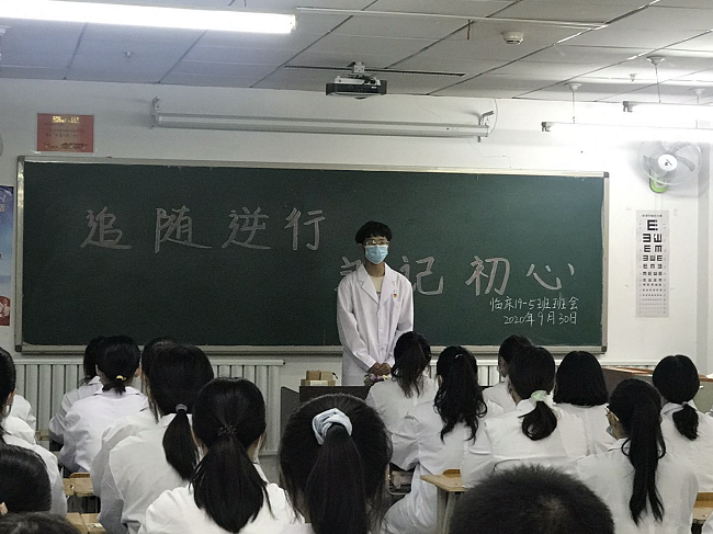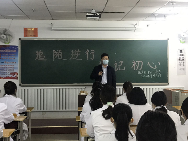 为深入贯彻落学习总书记关于“打赢新冠肺炎疫情防控阻击战重要指示批示”精神,进一步加强我院大学生的思想政治教育和价值引领,激发大家的爱国热情和使命担当,2020年9月30日下午,第一实验楼302室公共卫生系临床19-5班开展了一堂以“追随逆行 永记初心”为主题的特殊而有意义的主题班会。学院党委书记曹希恩同志参会并作重要讲话。学管中心副主任庞建仓、公共卫生系系主任李玉明、公共卫生系学工科科长郭培共同参加,班主任邱换老师主持此次班会。