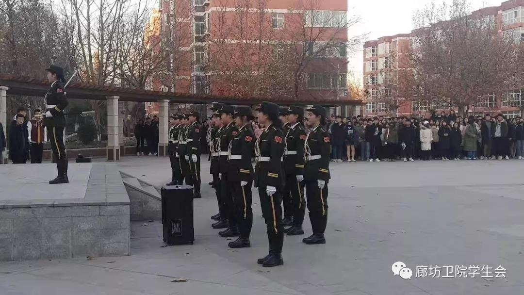 风和日丽,阳光明媚,今天是十二月的第一个周一,廊坊卫生职业学院全体师生在主教前广场举行2019-2020学年第十三周升旗仪式。集合通知送达,学院师生迅速来到升旗地点准备升旗。